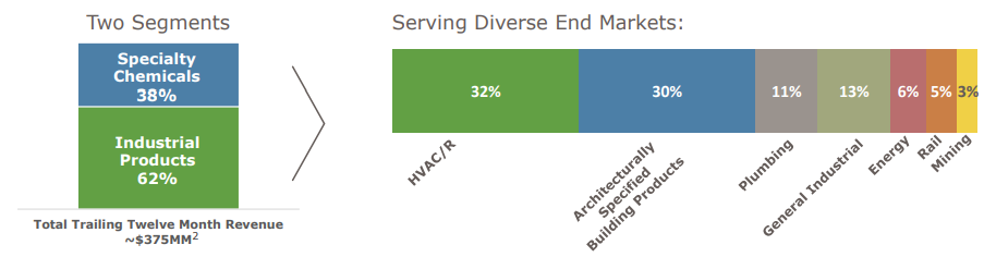 The Specialty Chemicals segment (~40% of revenue) consists of high performance specialty lubricants and sealants. These products are typically utilized to extend the life of capital equipment such as cranes, rail systems, mining equipment, air conditioning units, water wells and oil rigs.